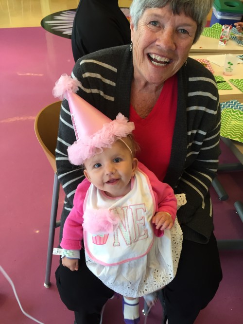 My mom cooked a great dinner, the fam loaded up a few cars (there were 9 people) and made the trek down to Children’s. My husband’s parents were in town too, making the total number around the table 14. Lyra wore her birthday dress, hat and bib (even though she really couldn’t eat), and we all just celebrated her being here with us. She even had a little taste of frosting.